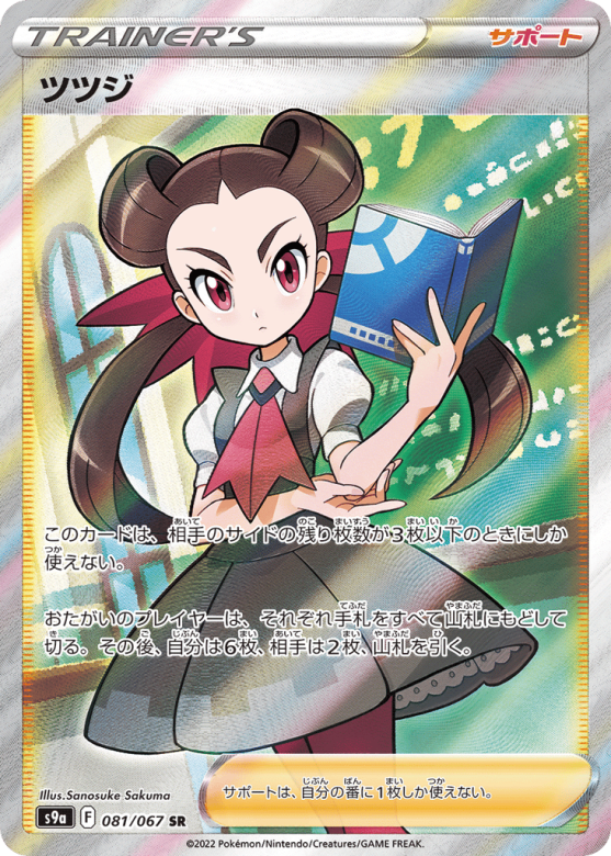 このカードは、相手のサイドの残り枚数が3枚以下のときにしか使えない。 おたがいのプレイヤーは、それぞれ手札をすべて山札にもどして切る。その後、自分は6枚、相手は2枚、山札を引く。 サポートは、自分の番に1枚しか使えない。