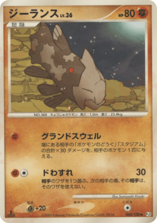 場にある相手の「ポケモンのどうぐ」「スタジアム」の合計×30ダメージを、相手のポケモン1匹に与える。