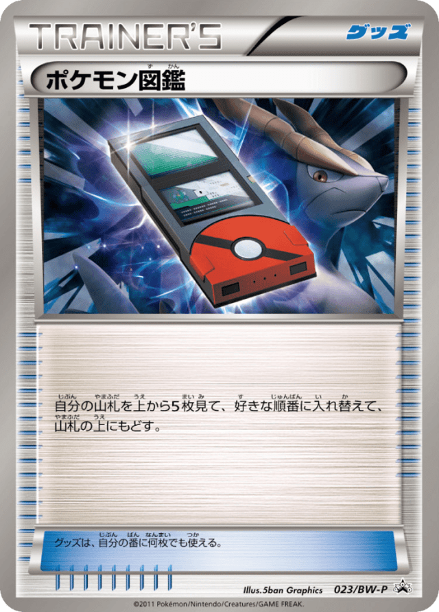 自分の山札を上から5枚見て、好きな順番に入れ替えて、山札の上にもどす。 グッズは、自分の番に何枚でも使える。