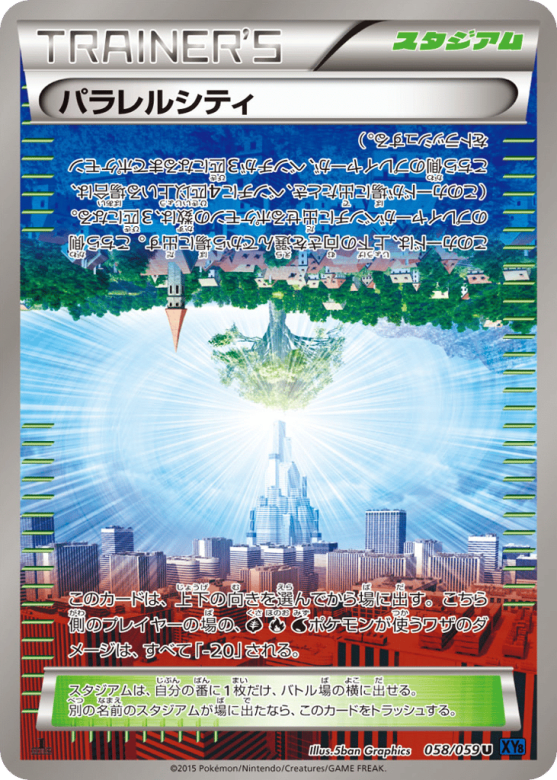 このカードは、上下の向きを選んでから場に出す。こちら側のプレイヤーがベンチに出せるポケモンの数は、3匹になる。(このカードが場に出たとき、ベンチに4匹以上いる場合は、こちら側のプレイヤーが、ベンチが3匹になるまでポケモンをトラッシュする。) スタジアムは、自分の番に1枚だけ、バトル場の横に出せる。別の名前のスタジアムが場に出たなら、このカードをトラッシュする。