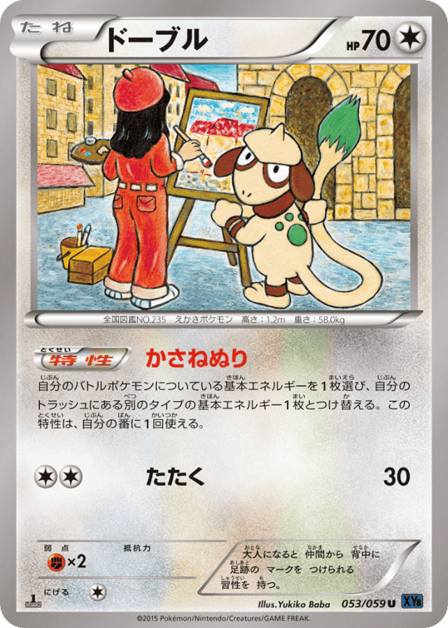 自分のバトルポケモンについている基本エネルギーを1枚選び、自分のトラッシュにある別のタイプの基本エネルギー1枚とつけ替える。この特性は、自分の番に1回使える。