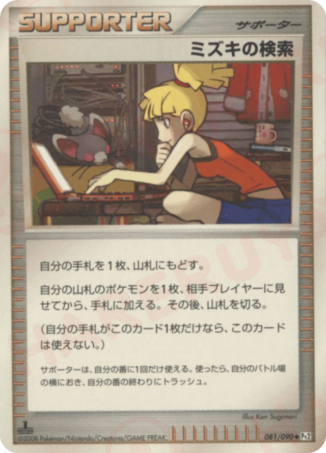 自分の手札を1枚、山札にもどす。<br> 自分の山札のポケモンを1枚、相手プレイヤーに見せてから、手札に加える。その後、山札を切る。<br> (自分の手札がこのカード1枚だけなら、このカードは使えない。) サポートは、自分の番に1枚しか使えない。