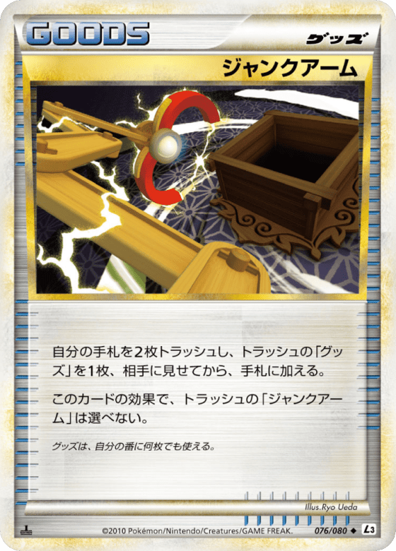 自分の手札を2枚トラッシュし、トラッシュの「グッズ」を1枚、相手に見せてから、手札に加える。<br> このカードの効果で、トラッシュの「ジャンクアーム」は選べない。 グッズは、自分の番に何枚でも使える。