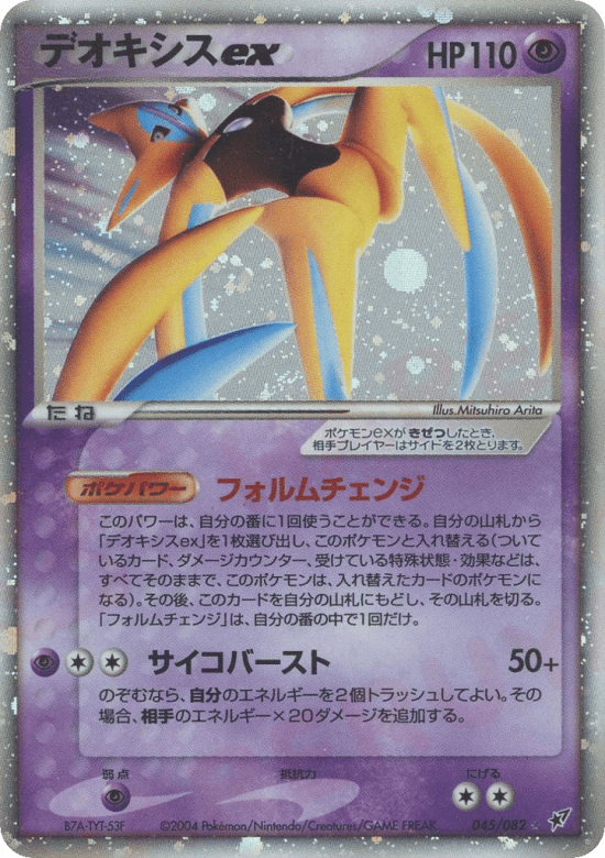 Once during your turn (before your attack), you may search your deck for another Deoxys ex and switch it with Deoxys ex. (Any cards attached to Deoxys ex, damage counters, Special Conditions, and effects on it are now on the new Pokémon.) If you do, put Deoxys ex on top of your deck. Shuffle your deck afterward. You can't use more than 1 Form Change Poké-Power each turn.