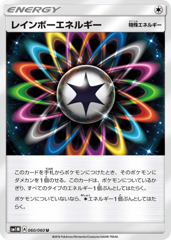 このカードを手札からポケモンにつけたとき、そのポケモンにダメカンを1個のせる。このカードは、ポケモンについているかぎり、すべてのタイプのエネルギー1個ぶんとしてはたらく。 ポケモンについていないなら、Colorlessエネルギー1個ぶんとしてはたらく。