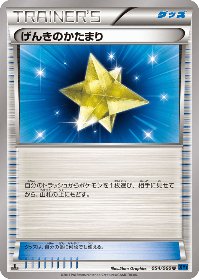 自分のトラッシュからポケモンを1枚選び、相手に見せてから、山札の上にもどす。 グッズは、自分の番に何枚でも使える。