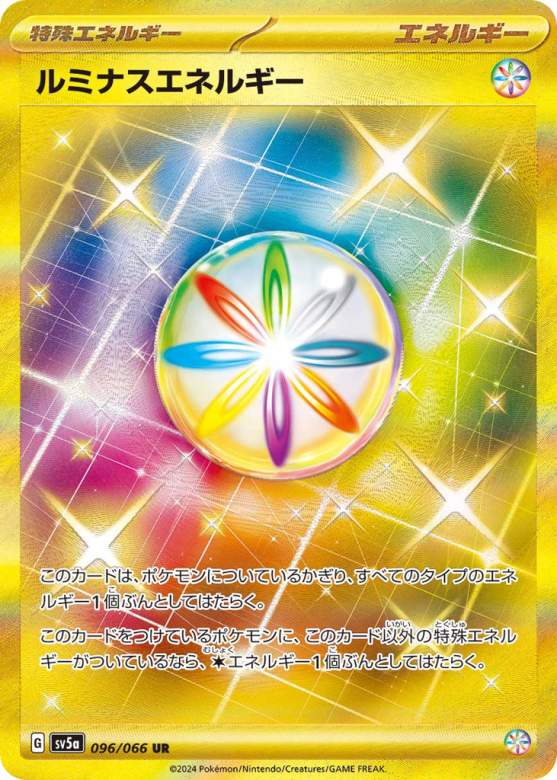 このカードは、ポケモンについているかぎり、すべてのタイプのエネルギー1個ぶんとしてはたらく。 このカードをつけているポケモンに、このカード以外の特殊エネルギーがついているなら、Colorlessエネルギー1個ぶんとしてはたらく。
