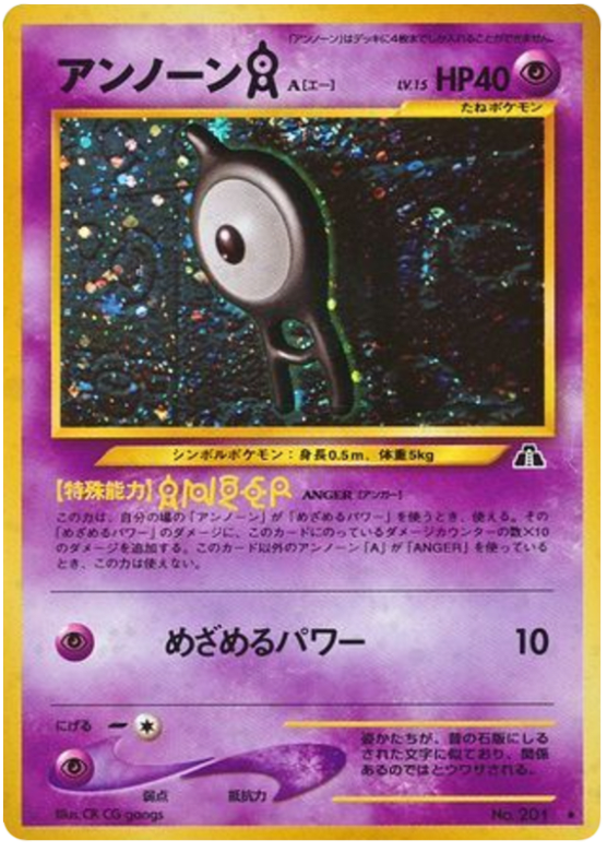 Whenever 1 of your Pokémon with Unown in its name uses its Hidden Power attack, that attack does 10 more damage for each damage counter on Unown [A]. If you have more than 1 Unown [A] in play, use only 1 [Anger] for each attack.