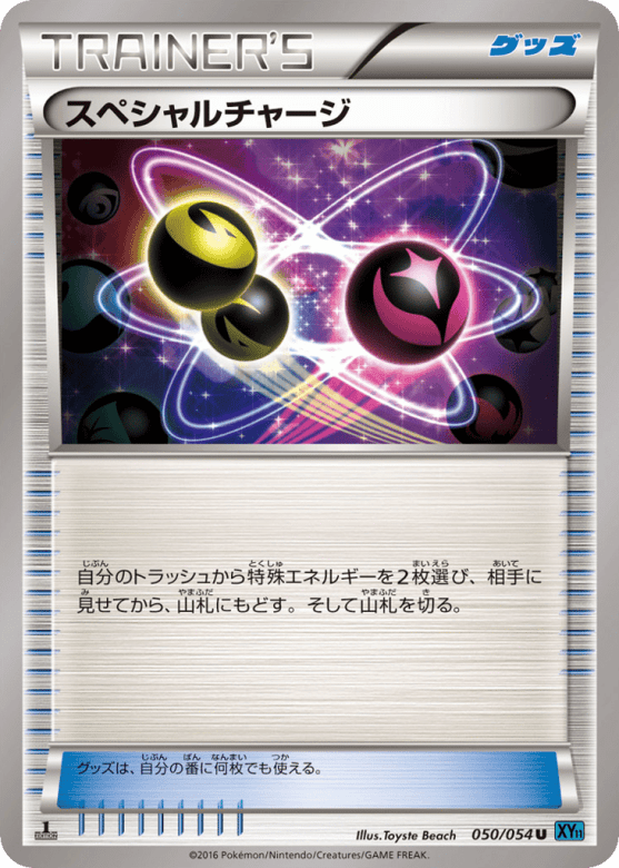 自分のトラッシュから特殊エネルギーを2枚選び、相手に見せてから、山札にもどす。そして山札を切る。 グッズは、自分の番に何枚でも使える。