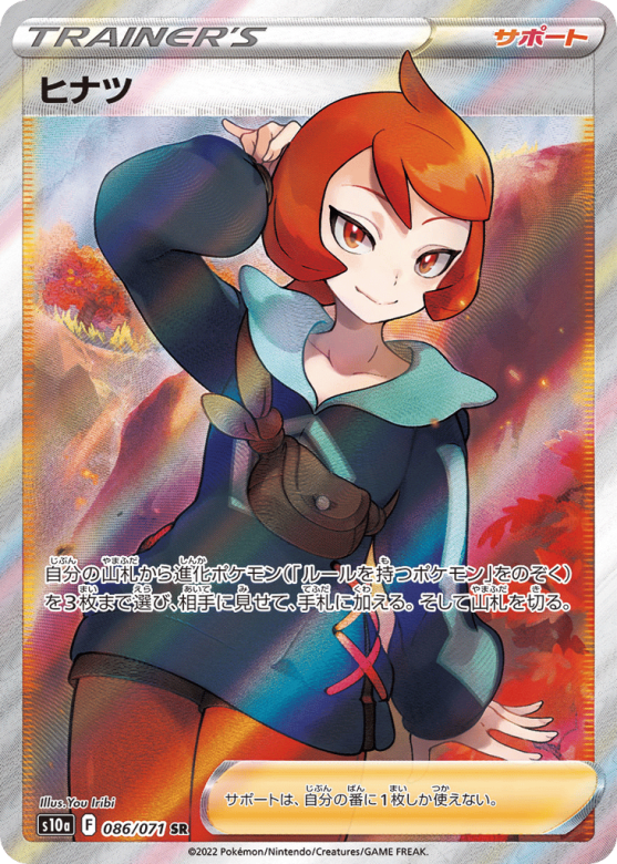 自分の山札から進化ポケモン(「ルールを持つポケモン」をのぞく)を3枚まで選び、相手に見せて、手札に加える。そして山札を切る。 サポートは、自分の番に1枚しか使えない。