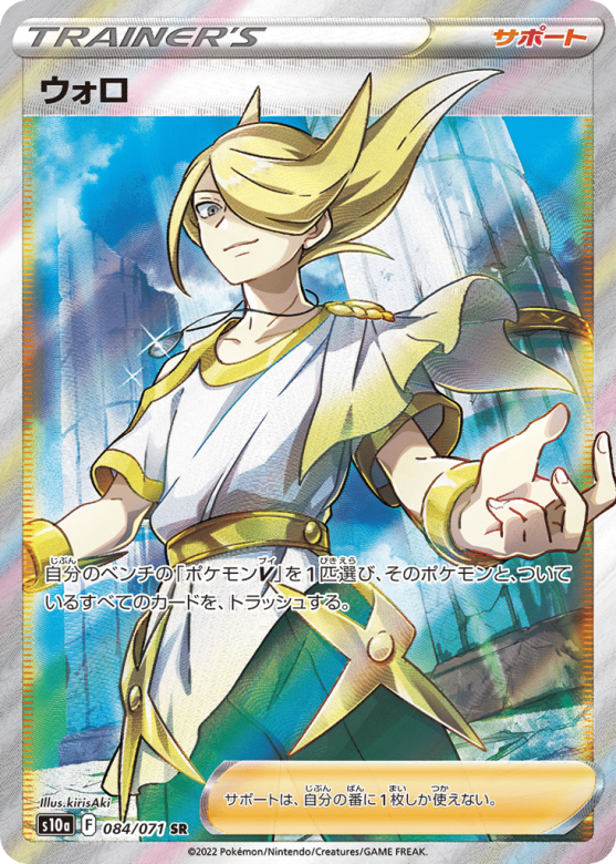 自分のベンチの「ポケモンV」を1匹選び、そのポケモンと、ついているすべてのカードを、トラッシュする。 サポートは、自分の番に1枚しか使えない。