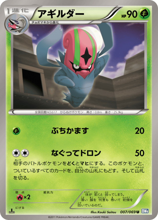 相手のバトルポケモンをどくとマヒにする。このポケモンと、ついているすべてのカードを、自分の山札にもどす。そして山札を切る。