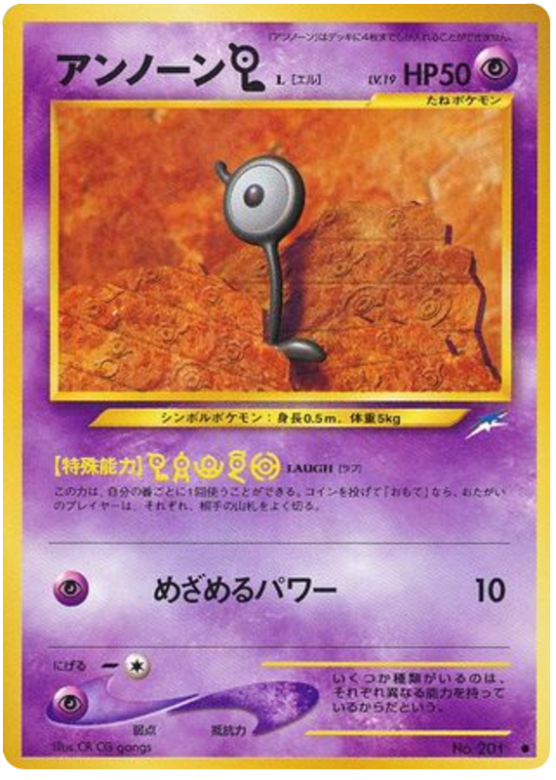 Once during your turn (before your attack), you may flip a coin. If heads, each player shuffles his or her deck. This power can be used even if Unown [L] is Asleep, Confused, or Paralyzed.