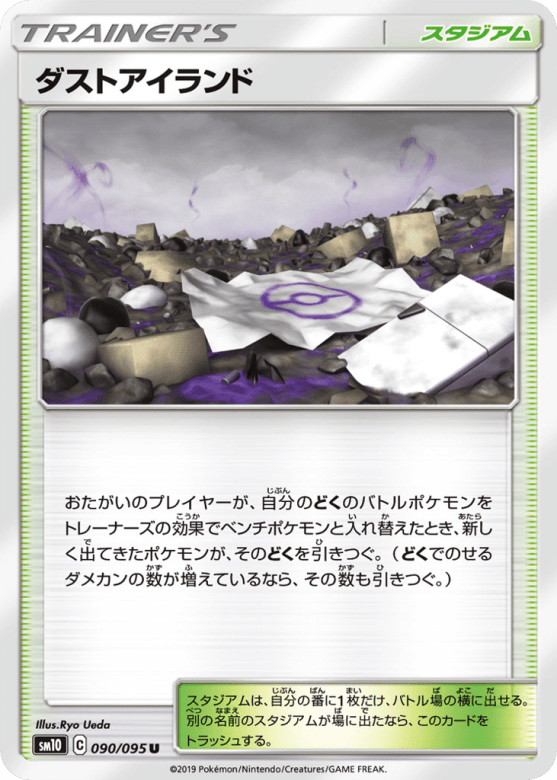 おたがいのプレイヤーが、自分のどくのバトルポケモンをトレーナーズの効果でベンチポケモンと入れ替えたとき、新しく出てきたポケモンが、そのどくを引きつぐ。(どくでのせるダメカンの数が増えているなら、その数も引きつぐ。) スタジアムは、自分の番に1枚だけ、バトル場の横に出せる。別の名前のスタジアムが場に出たなら、このカードをトラッシュする。