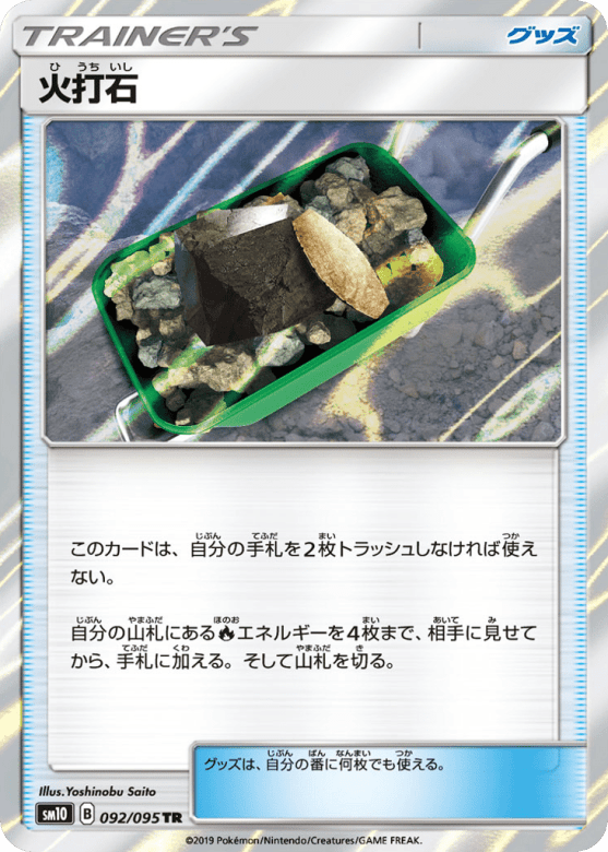 このカードは、自分の手札を2枚トラッシュしなければ使えない。 自分の山札にあるFireエネルギーを4枚まで、相手に見せてから、手札に加える。そして山札を切る。 グッズは、自分の番に何枚でも使える。