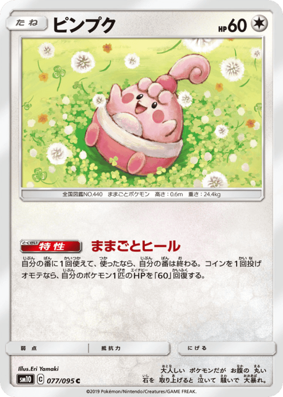 自分の番に1回使えて、使ったなら、自分の番は終わる。コインを1回投げオモテなら、自分のポケモン1匹のHPを「60」回復する。