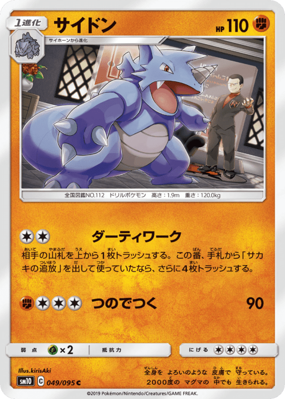 相手の山札を上から1枚トラッシュする。この番、手札から「サカキの追放」を出して使っていたなら、さらに4枚トラッシュする。
