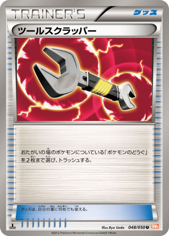 おたがいの場のポケモンについている「ポケモンのどうぐ」を2枚まで選び、トラッシュする。 グッズは、自分の番に何枚でも使える。