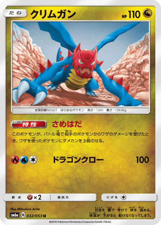 このポケモンが、バトル場で相手のポケモンからワザのダメージを受けたとき、ワザを使ったポケモンにダメカンを3個のせる。