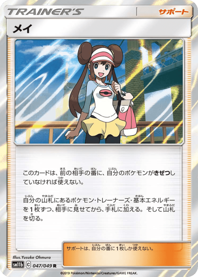 このカードは、前の相手の番に、自分のポケモンがきぜつしていなければ使えない。 自分の山札にあるポケモン・トレーナーズ・基本エネルギーを1枚ずつ、相手に見せてから、手札に加える。そして山札を切る。 サポートは、自分の番に1枚しか使えない。
