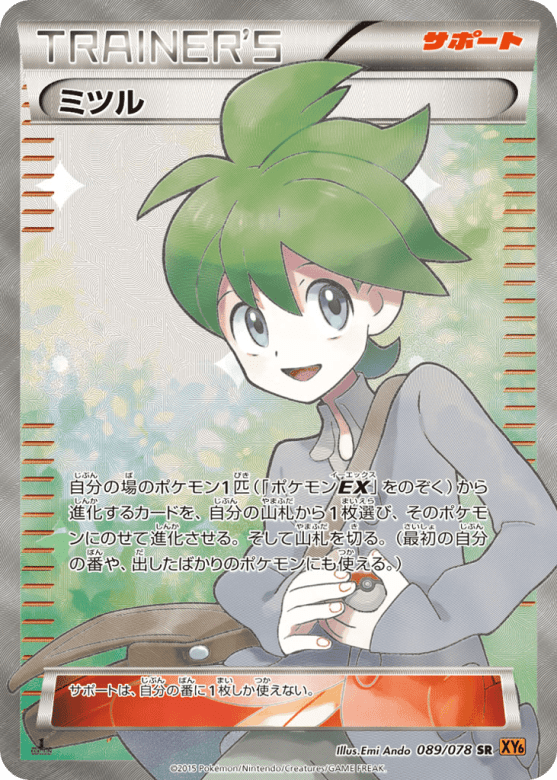 自分の場のポケモン1匹(「ポケモンEX」をのぞく)から進化するカードを、自分の山札から1枚選び、そのポケモンにのせて進化させる。そして山札を切る。(最初の自分の番や、出したばかりのポケモンにも使える。) サポートは、自分の番に1枚しか使えない。