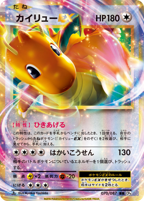 この特性は、このカードを手札からベンチに出したとき、1回使える。自分のトラッシュからたねポケモン(「カイリューEX」をのぞく)を2枚選び、相手に見せてから、手札に加える。