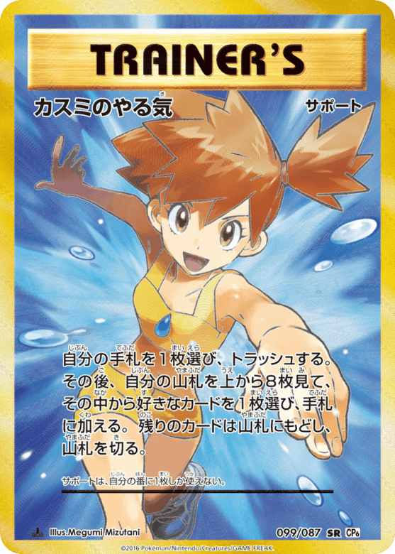自分の手札を1枚選び、トラッシュする。その後、自分の山札を上から8枚見て、その中から好きなカードを1枚選び、手札に加える。残りのカードは山札にもどし、山札を切る。 サポートは、自分の番に1枚しか使えない。