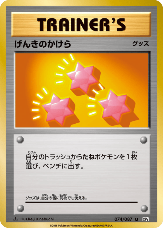 自分のトラッシュからたねポケモンを1枚選び、ベンチに出す。 グッズは、自分の番に何枚でも使える。