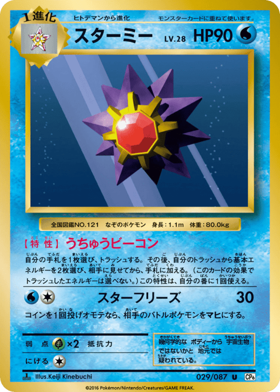自分の手札を1枚選び、トラッシュする。その後、自分のトラッシュから基本エネルギーを2枚選び、相手に見せてから、手札に加える。(このカードの効果でトラッシュしたエネルギーは選べない。)この特性は、自分の番に1回使える。