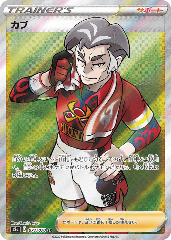 自分の手札をすべて山札にもどして切る。その後、山札を4枚引く。自分の場のポケモンがバトルポケモンだけなら、引く枚数は8枚になる。 サポートは、自分の番に1枚しか使えない。