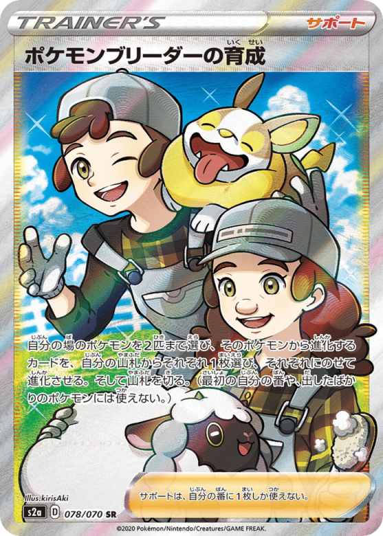 自分の場のポケモンを2匹まで選び、そのポケモンから進化するカードを、自分の山札からそれぞれ1枚選び、それぞれにのせて進化させる。そして山札を切る。(最初の自分の番や、出したばかりのポケモンには使えない。) サポートは、自分の番に1枚しか使えない。