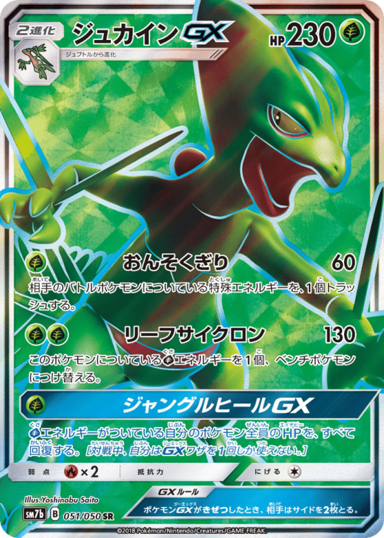 Grassエネルギーがついている自分のポケモン全員のHPを、すべて回復する。[対戦中、自分はGXワザを1回しか使えない。]