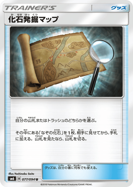 自分の山札またはトラッシュのどちらかを選ぶ。 その中にある「なぞの化石」を1枚、相手に見せてから、手札に加える。山札を見たなら、山札を切る。 グッズは、自分の番に何枚でも使える。