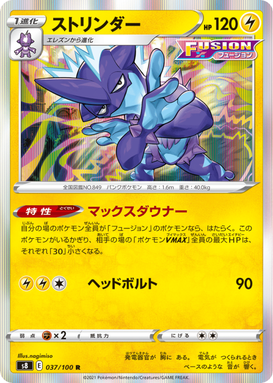 自分の場のポケモン全員が「フュージョン」のポケモンなら、はたらく。このポケモンがいるかぎり、相手の場の「ポケモンVMAX」全員の最大HPは、それぞれ「30」小さくなる。