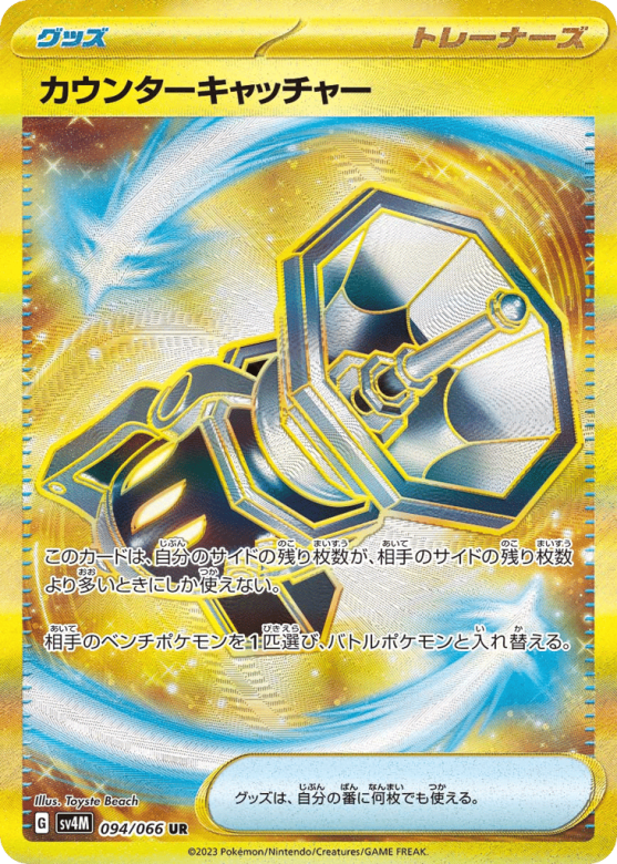 このカードは、自分のサイドの残り枚数が、相手のサイドの残り枚数より多いときにしか使えない。 相手のベンチポケモンを1匹選び、バトルポケモンと入れ替える。 グッズは、自分の番に何枚でも使える。