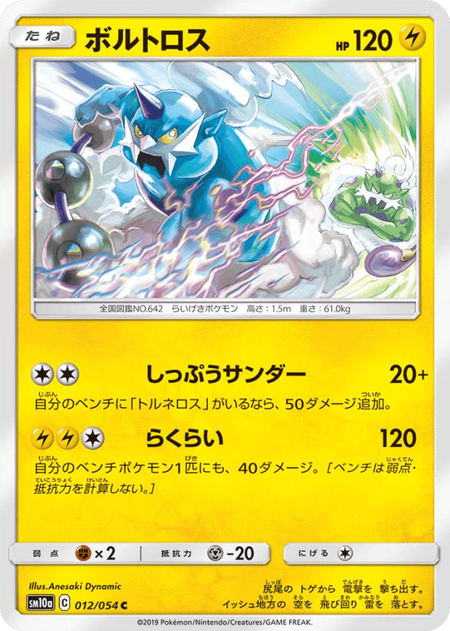 尻尾の トゲから 電撃を 撃ち出す。 イッシュ地方の 空を 飛び回り 雷を 落とす。