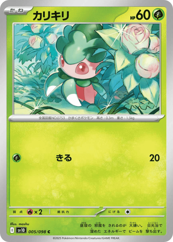 昼寝の 邪魔を されるのが 大嫌い。 日光浴で 溜めた エネルギーで ビームを 撃ち出す。 (Fomantis hates having its naps interrupted. It fires off beams using energy it gathers by bathing in the sun.)