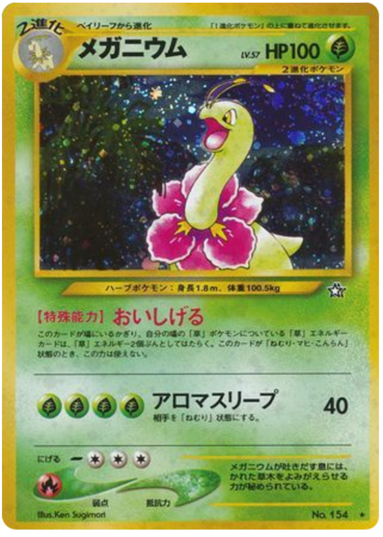 As long as Meganium is in play, each Grass Energy card attached to your Grass Pokémon instead provides Grass Grass. This power stops working while Meganium is Asleep, Confused, or Paralyzed.
