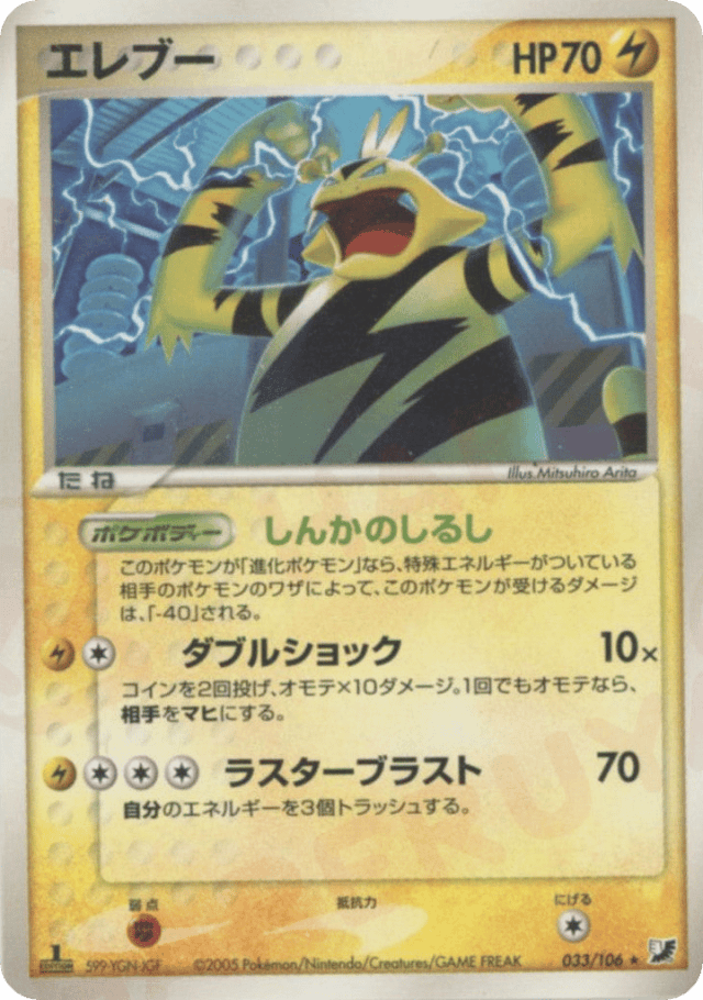 As long as Electabuzz is an Evolved Pokémon, any damage done to Electabuzz by attacks from your opponent's Pokémon that has any Special Energy cards attached to it is reduced by 40 (after applying Weakness and Resistance).