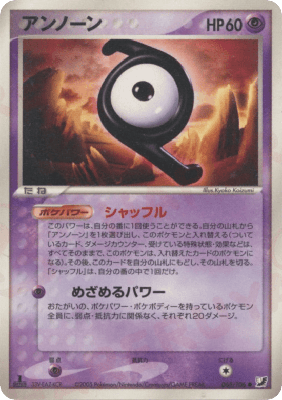 Once during your turn (before your attack), you may search your deck for another Unown and switch it with Unown. (Any cards attached to Unown, damage counters, Special Conditions, and effects on it are now on the new Pokémon.) If you do, put Unown on top of your deck. Shuffle your deck afterward. You can't use more than 1 Shuffle Poké-Power each turn.