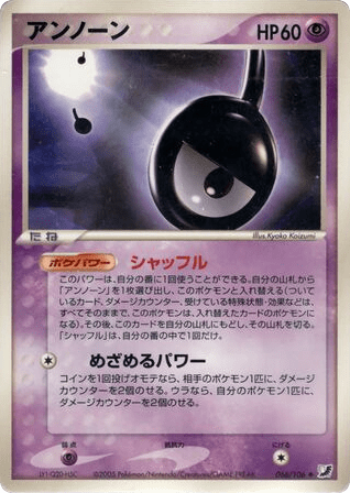 Once during your turn (before your attack), you may search your deck for another Unown and switch it with Unown. (Any cards attached to Unown, damage counters, Special Conditions, and effects on it are now on the new Pokémon.) If you do, put Unown on top of your deck. Shuffle your deck afterward. You can't use more than 1 Shuffle Poké-Power each turn.