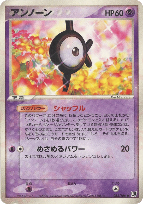 Once during your turn (before your attack), you may search your deck for another Unown and switch it with Unown. (Any cards attached to Unown, damage counters, Special Conditions, and effects on it are now on the new Pokémon.) If you do, put Unown on top of your deck. Shuffle your deck afterward. You can't use more than 1 Shuffle Poké-Power each turn.