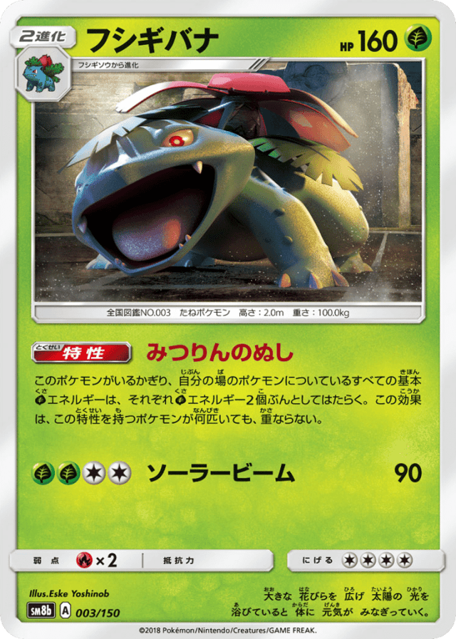 このポケモンがいるかぎり、自分の場のポケモンについているすべての基本Grassエネルギー2個ぶんとしてはたらく。この効果は、この特性を持つポケモンが何匹いても、重ならない。