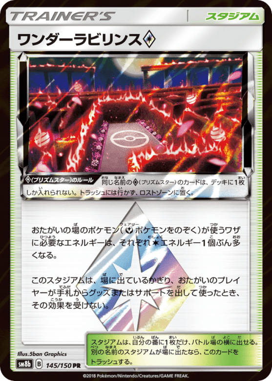 おたがいの場のポケモン(Fairyエネルギー1個ぶん多くなる。 このスタジアムは、場に出ているかぎり、おたがいのプレイヤーが手札からグッズまたはサポートを出して使ったとき、その効果を受けない。 スタジアムは、自分の番に1枚だけ、バトル場の横に出せる。別の名前のスタジアムが場に出たなら、このカードをトラッシュする。