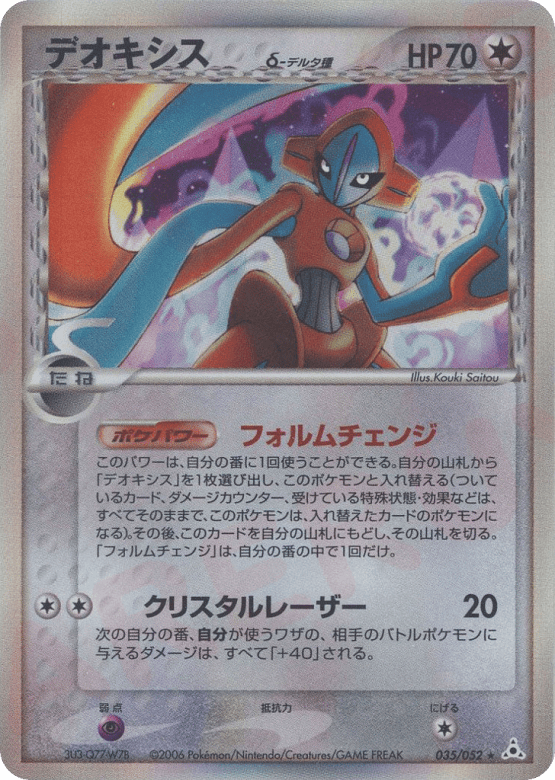 Once during your turn (before your attack), you may search your deck for another Deoxys and switch it with Deoxys. (Any cards attached to Deoxys, damage counters, Special Conditions, and effects on it are now on the new Pokémon.) If you do, put Deoxys on top of your deck. Shuffle your deck afterward. You can't use more than 1 Form Change Poké-Power each turn.