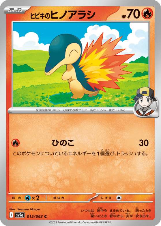 いつもは 背中を まるめている。 怒ったとき 驚いたとき 背中から 炎が 吹き出す。 (It usually stays hunched over. If it is angry or surprised, it shoots flames out of its back.)