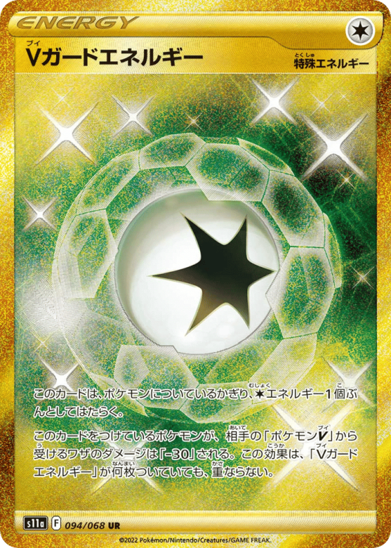 このカードは、ポケモンについているかぎり、Colorlessエネルギー1個ぶんとしてはたらく。 このカードをつけているポケモンが、相手の「ポケモンV」から受けるワザのダメージは「-30」される。この効果は、「Vガードエネルギー」が何枚ついていても、重ならない。