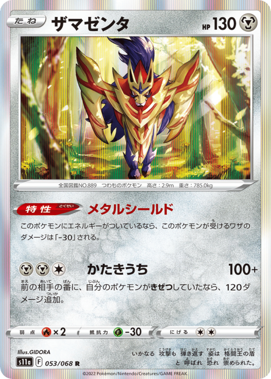 このポケモンにエネルギーがついているなら、このポケモンが受けるワザのダメージは「-30」される。