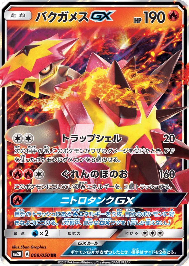 自分のトラッシュにあるFireエネルギーを5枚、自分のポケモンに好きなようにつける。[対戦中、自分はGXワザを1回しか使えない。]