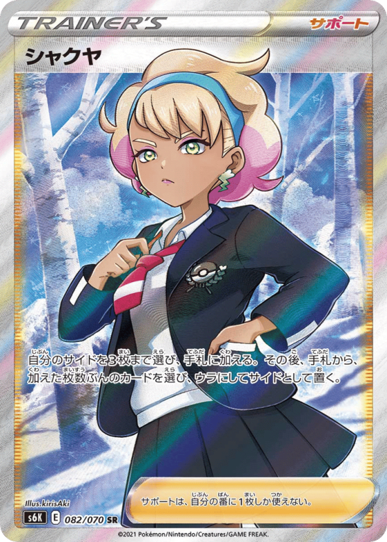 自分のサイドを3枚まで選び、手札に加える。その後、手札から、加えた枚数ぶんのカードを選び、ウラにしてサイドとして置く。 サポートは、自分の番に1枚しか使えない。